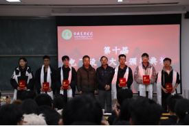 闭幕式上,首先,为大家展示了选手们在参赛过程中的优异表现。随后,唐波老师对本次大赛作出总结,同时,鼓励同学们积极参加此类比赛,并勉励未获奖同学继续加油。然后,公共教学部王佳荧作为学生代表发言,讲述了自己在活动中的收获与成长。最后,大学生创新创业实验中心成员普琪主持并宣读获奖名单,并由各位领导给获奖同学颁奖并合影留念。
