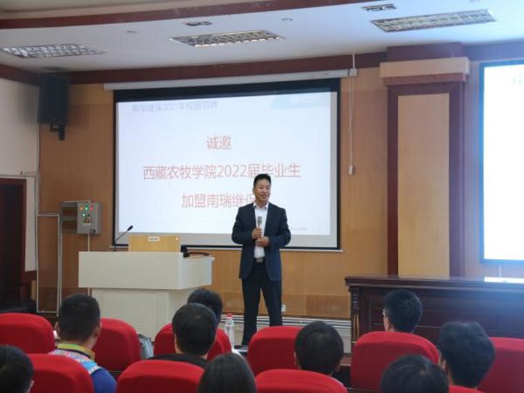 为深入落实习近平新时代中国特色社会主义思想,切实践行“就业是最大民生”理念,促使我院毕业生转变就业观念、拓宽就业渠道,南京南瑞继保有限公司应邀于2021年10月19日上午11:30在圣浓宾馆会议室举行校园招聘宣讲会。南瑞继保华中片区总经理谢珂、副总经理张军、西藏省区负责人王庆华、学长张德峰和我院党委书记达娃次仁、学生科辅导员毛小军以及2022届全体毕业生和2019级全体学生参加了此次招聘宣讲会。