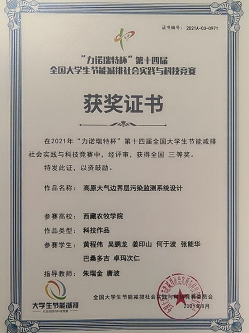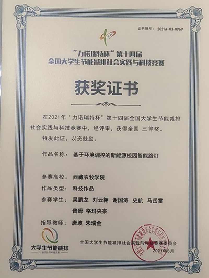 8月27日至28日,“力诺瑞特杯”第十四届全国大学生节能减排社会实践与科技竞赛在山东大学举办。最终,由我院朱瑞金、唐波等老师指导,吴鹏龙,普姆等同学的《基于环境调控的新能源校园智能路灯》;张能华,姜印山等同学的《适用于西藏高寒环境的智能化互联畜牧养殖系统》;黄程伟,巴桑多吉等同学的《高原大气边界层污染监测系统设计》等三项项目荣获全国三等奖。我校组织电气、水土等学院同学组成的十五支参赛队伍参加本届比赛,获得全国三等奖3项,赛事成绩优异,由此西藏农牧学院获评优秀组织奖。