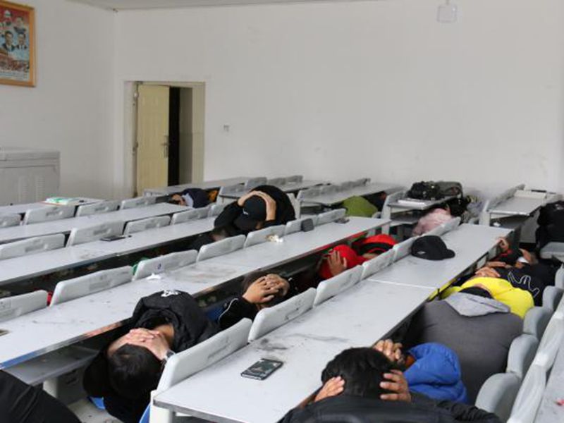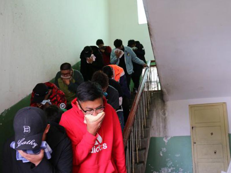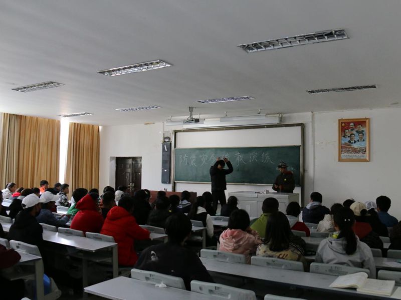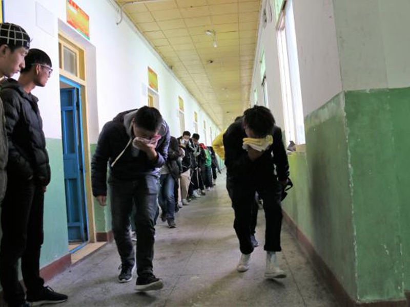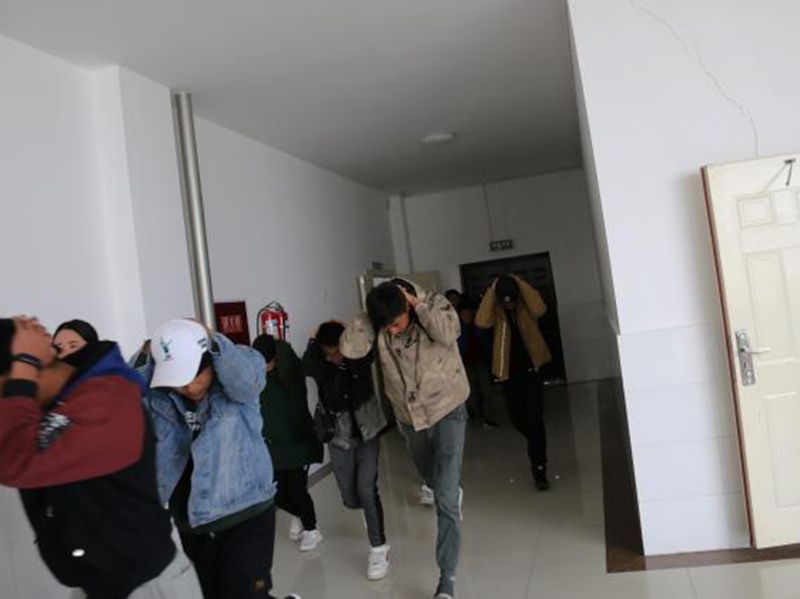 首先,由团学干部给同学们普及防震、消防安全知识。其次,随着警报声响起,同学们先进行紧急避险,在发现时间足以撤离,再进行疏散,迅速到达指定地点集合。随后,团学干部立即指挥学生按照既定方案和路线指挥同学们撤离宿舍,学生们都用湿毛巾或衣服捂住鼻子和嘴巴,弯着腰,排成两排,贴着和墙壁,迅速地跑出了宿舍并有序向操场疏散。基本按预定时间完成了防震、防火紧急逃生安全疏散的演练。整个演练过程严肃、认真、紧张、有序、高效,全部学生撤离到指定位置。