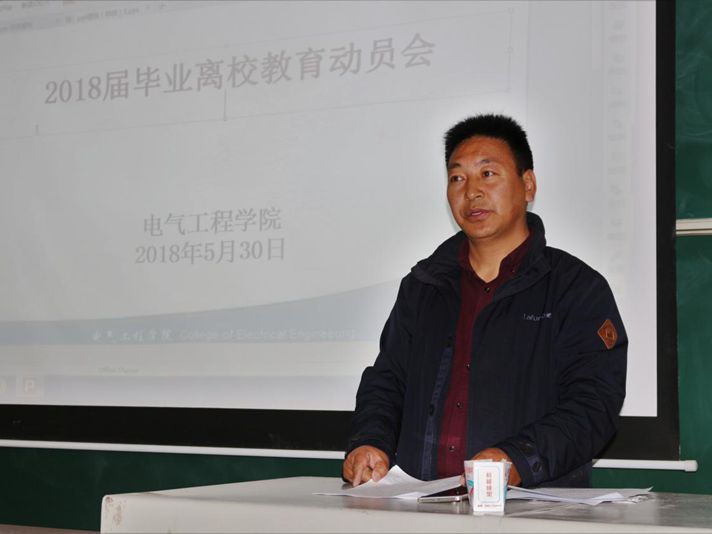 在会上,首先由达娃次仁书记做了动员讲话,他代表电气工程学院党委和全体教职工向圆满完成学业,即将离校的我院2018届77名毕业生表示最热烈的祝贺,并对毕业生提出了殷切的期望:一是希望他们坚定理想信念、志向高远,把个人梦融入中国梦;二是希望他们牢记历史、珍惜当下,旗帜鲜明地反对分裂,立场坚定地维护民族团结,真心实意地拥戴信赖忠诚捍卫核心;三是暂时未就业的同学,希望他们转变思想观念,努力实现多岗位多渠道创业就业;四是希望他们心怀感恩之情,践行四讲四爱;五是希望他们坚守在母校的最后一班岗位,为母校献上一份爱心;六是希望他们能够尽快适应新的生活,开启崭新人生;七是学院师生深情意重,期待毕业生常回家看一看。达娃次仁书记热情洋溢的讲话,充满深情,感染了会场上每一位师生。