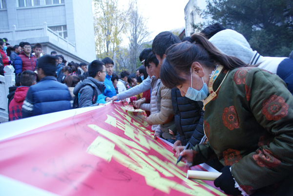 宣传活动开始,普布次仁书记就此次大型禁毒宣传签字活动进行动员讲话,活动当天天气异常寒冷,然而同学们依旧表现出高涨的热情,在团总支干部的协助下,我院同学们有序地在禁毒横幅上签了自己的名字,这不仅是对本次活动的大力支持和倡导,也是对自身远离毒品的提醒和承诺。
