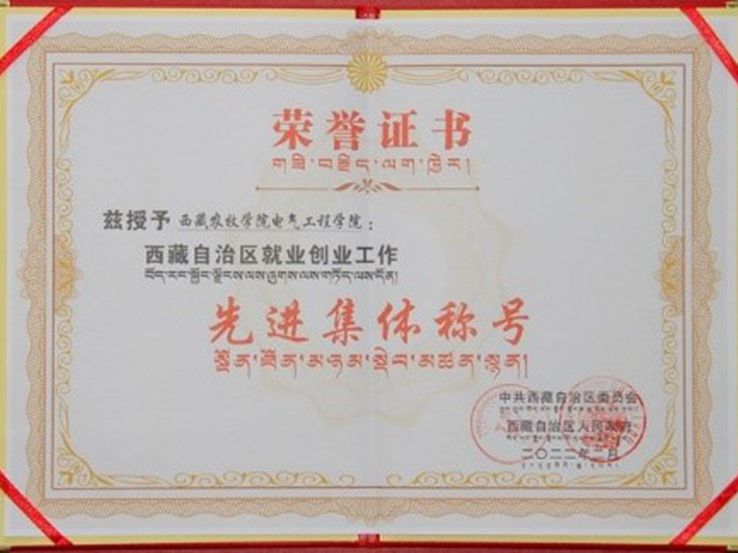 日前,中共西藏自治区委员会、西藏自治区人民政府授予西藏农牧学院电气工程学院“西藏自治区就业创业工作先进集体”荣誉称号。