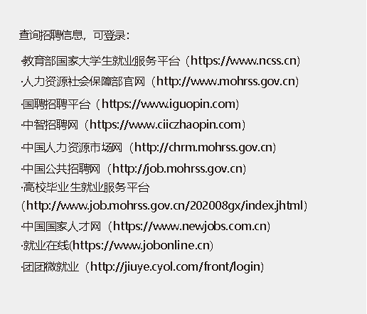 高校毕业生可通过国家大学生就业服务平台、高校就业网 站、国聘平台等国家有关部门、地方和高校的校园招聘等获取政 策文件、招聘岗位、服务指南等就业信息。