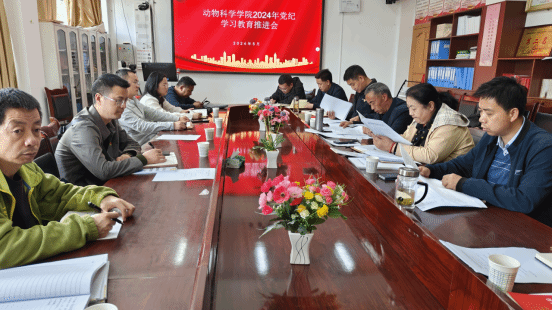 2024年5月24日下午,动物科学学院党委召开2024年党纪学习教育推进会,会议由动物科学学院党委副书记刘锁珠主持,动物科学学院党委班子成员、动物科学学院全体教工党员以及动物科学学院学生党员代表参加本次会议。