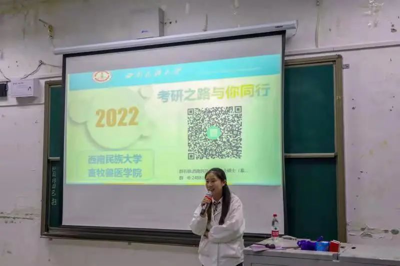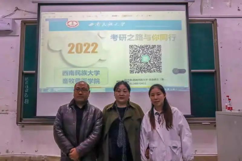会议伊始,索朗斯珠老师为同学们介绍了两位老师此行的目的和招生宣讲的重要意义,并代表学院对两位老师表示由衷的感谢。紧接着,刘益丽老师为同学们分析了近两年研究生与本科生升学情况及就业现状。随后,她从专业招生计划、畜牧专硕点设置、学院重要研究成果、导师队伍、学校概况五个方面向同学们介绍了西南民族大学畜牧兽医学院的基本概况。其中,她尤其强调了农业硕士(畜牧)专业采用的校内校外双导师制的特殊培养方式,并重点介绍了西南民族大学新增的“畜牧学”博士点以及学校优惠的奖助政策。