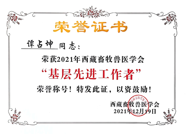 经专家委员会评选,谭占坤荣获2021年西藏畜牧兽医学会“基层先进工作者”荣誉称号。