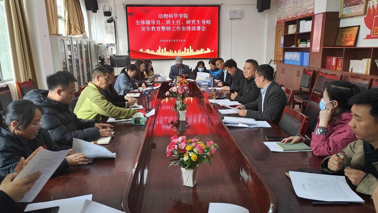 为进一步推进平安校园建设,落实学校安全教育专项整顿相关通知要求,加强校园安全管理,动物科学学院于2024年10月29日10:00在1302会议室召开了班主任、辅导员、研究生导师安全教育整顿工作部署会,会议由学院党委副书记石徐主持,学院党委书记米玛顿珠及全体辅导员、班主任、研究生指导老师参加。