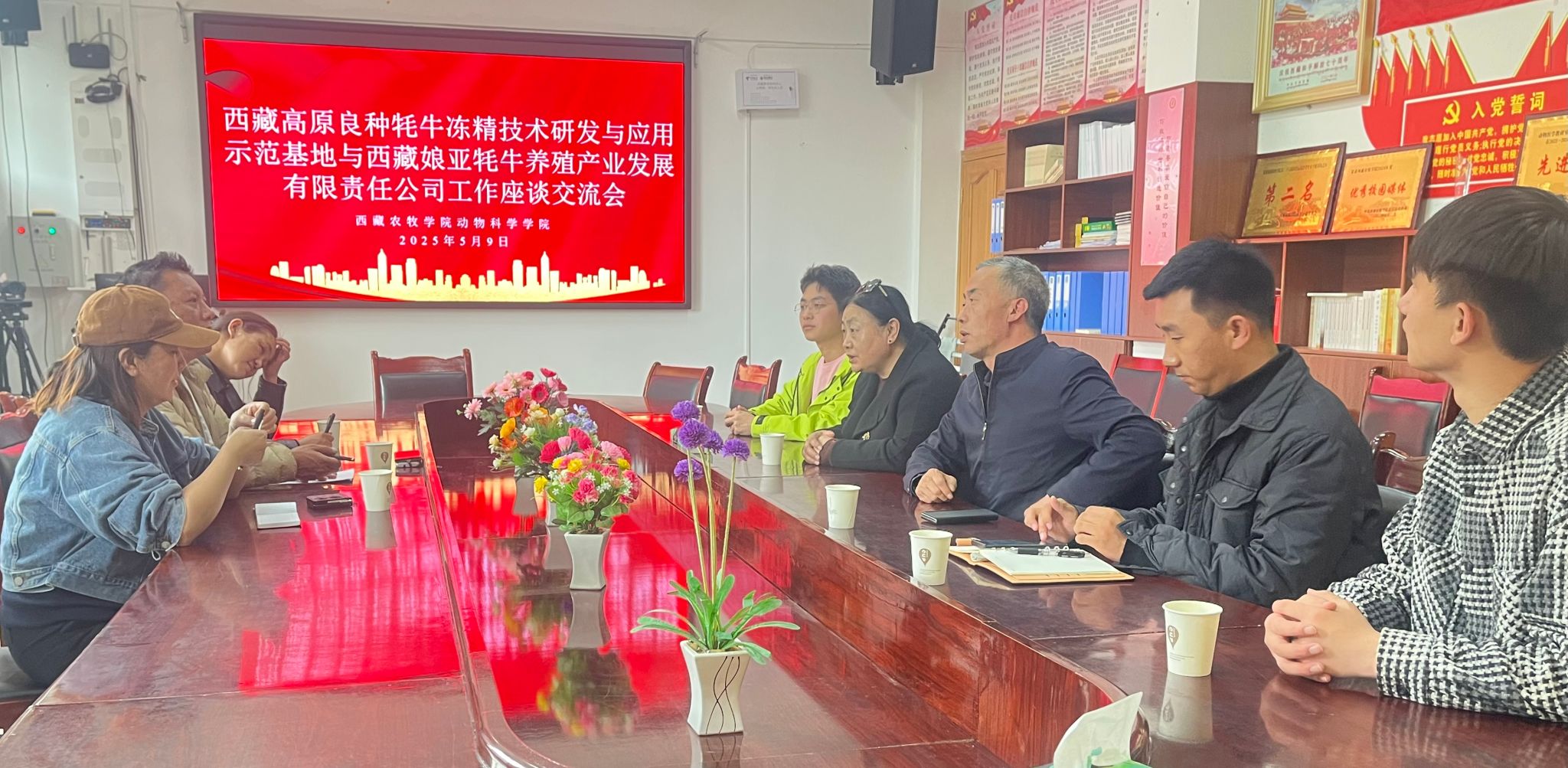 为做好2025年中央财政基层农技推广体系改革与建设项目实施工作,深入贯彻《农业农村部科学技术司关于2025年基层农技推广体系改革与建设项目实施方案预通知》精神,促进新时代科技创新和科学普及事业协同发展,推动西藏高原良种牦牛养殖产业的创新增效,加强产学研合作。西藏农牧学院动物科学学院于2025年5月9日在西藏农牧学院举办了“西藏高原良种牦牛冻精技术研发与示范基地与西藏娘亚牦牛养殖产业发展有限责任公司交流座谈会”,标志着该项目正式启动。旨在通过深度交流与问题解析,共同探索高原良种牦牛冻精技术的优化路径,提升牦牛养殖产业的科技含量与经济效益,助力西藏农牧业的高质量发展。