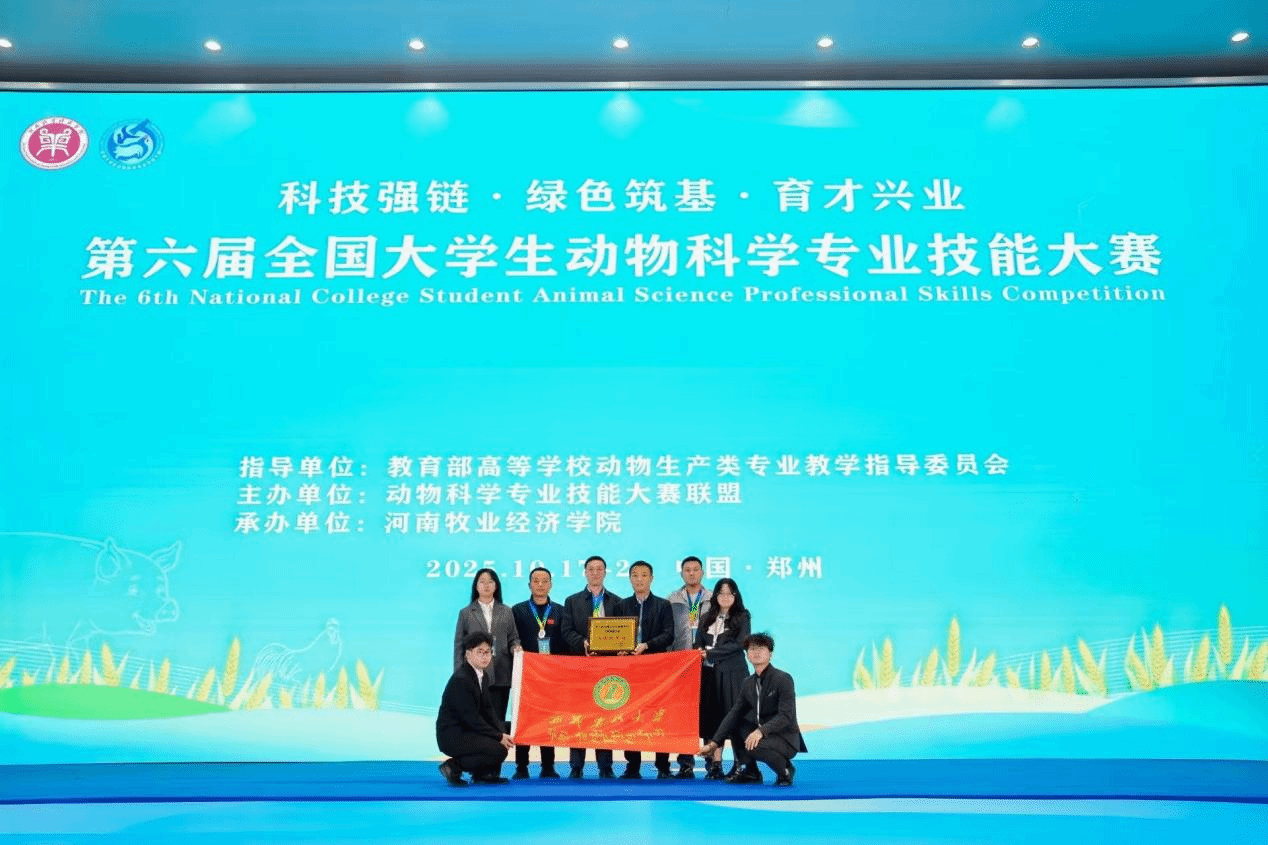 2025年10月18日至19日,第六届全国大学生动物科学专业技能大赛在河南省郑州市举行。本次大赛由教育部高等学校动物生产类专业教学指导委员会主办,河南牧业经济学院承办。在我校教务处的大力支持下,动物科学学院代表队凭借精湛的专业技能与出色的现场发挥,荣获大赛最高荣誉——“团体特等奖”。