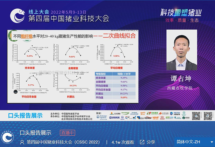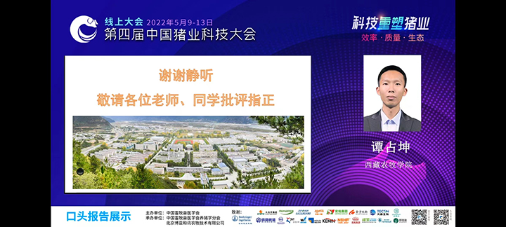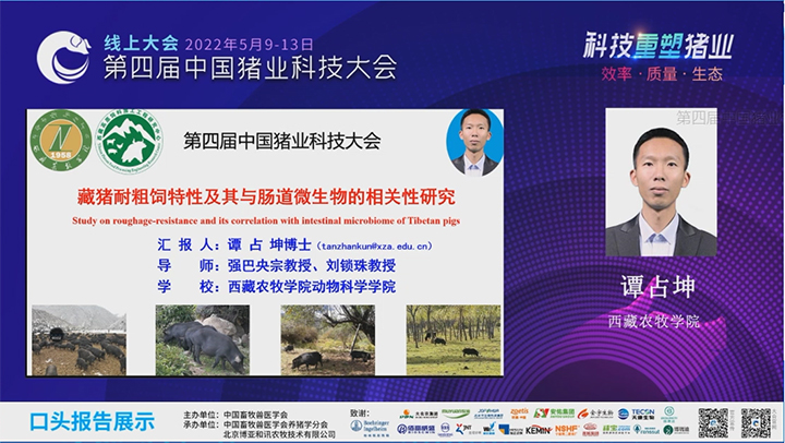 动物科学学院谭占坤副教授在大会上做口头报告,报告题目为“藏猪耐粗饲特性与肠道微生物的相关性研究”。