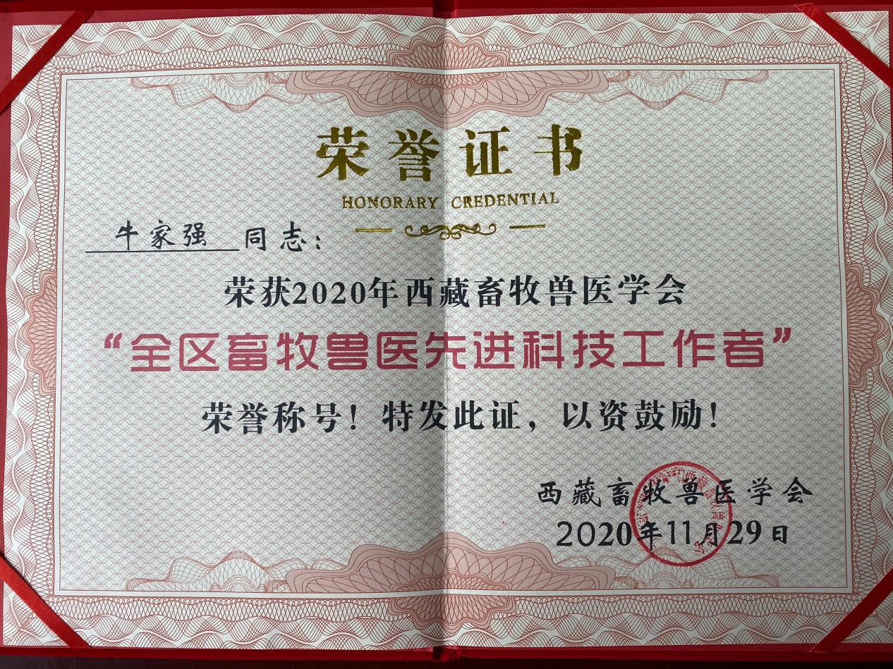 牛家强副教授应邀做了题为“新冠疫情下的动物疫病防控”的主题报告。徐业芬、谭占坤、商振达、孔庆辉4位老师与董世雄、李梦柔2位研究生做了大会学术论文交流。经专家委员会评选,牛家强荣获2020年畜牧兽医学会“全区畜牧兽医先进科技工作者”称号。徐业芬论文“牦牛卵母细胞成熟培养及细胞因子作用试验”与孔庆辉论文“藏猪小肠形态、消化酶及微生物多样性研究”获优秀论文。