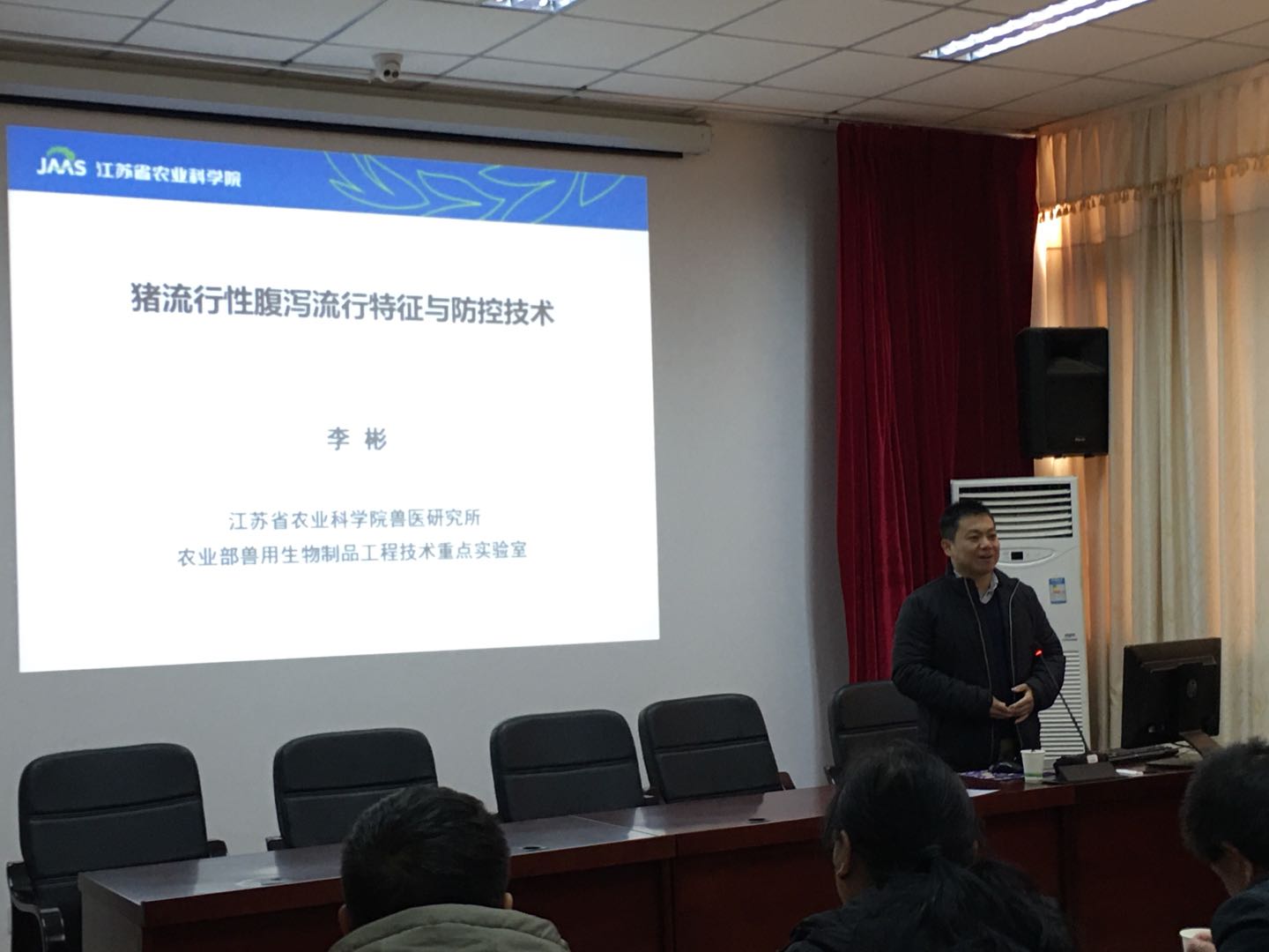 2019年12月5日-7日,江苏省农业科学院陈国平书记、张小飞所长、李彬副所长、刘茂军研究员一行四人来我院进行洽谈交流合作。期间,12月5日下午,在图书馆报告厅举行学术交流活动,动物科学学院索朗斯珠院长及全院师生员工80多人参加。张小飞、李彬、刘茂军三人分别做了题为“走进和了解江苏农科院兽医所” “猪流行性腹泻流行特征与防控技术” “一种山羊新发传染病——山羊副流感病毒3型研究”的三个专题报告。报告会由学院党委副书记、副院长熊富强主持。