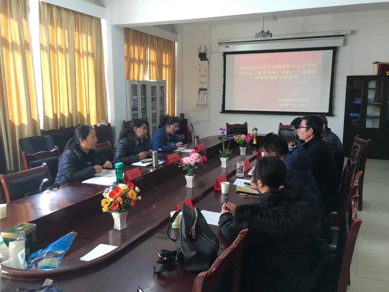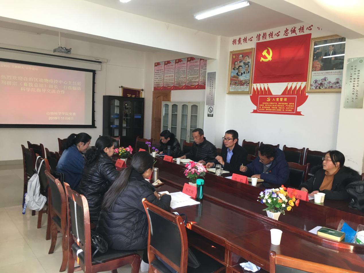 座谈会上,首先苗书记代表动物科学学院党委热烈欢迎(畜牧总站)尼玛群宗站长一行莅临指导交流工作,苗书记详细介绍了西藏农牧学院动物科学学院教师队伍、学科设置、学生培养、科学研究及教学工作,畅谈了对两家单位深度合作的一些想法建议,并感谢畜牧总站长期以来对动科学院工作的支持。会上,刘锁珠副院长谈到10月下旬与西藏自治区动物疫控中心“西藏农牧学院教学科研就业见习基地”的揭牌仪式,标志着两家单位全面深化务实合作、共同破解全区畜牧兽医发展难题、联合培养畜牧兽医专业人才工作的全面启动。两家的合作无论从实验室条件还是实习基地,都有利于双方更好的开展工作。此次合作,更加结合双方工作,做到资源共享,既锻炼了学生,又减轻了对方负担。尼玛群宗站长就西藏自治区动物疫病预防控制中心(畜牧总站)业务职能与西藏农牧学院学科设置进行分析,指出西藏农牧学院教学科研与西藏自治区动物疫病预防控制中心(畜牧总站)科研、技术推广工作的高度契合性,针对动物科学学院安排优秀本科生、研究生到疫控中心实践锻炼和鼓励西藏自治区动物疫控中心专业技术人员赴西藏农牧学院深造学习方面等方面提出了一些想法和建议;尼玛群宗主任(站长)就人才共同培养、科研项目联合申报等与动科学院各领导进行了交流。