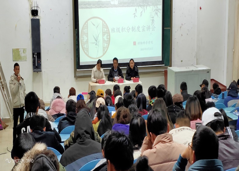 为培养动物科学学院全体同学良好的习惯,加强全院学生纪律性和集体意识,动物科学学院学生科全体辅导员与主席团成员共同商议制定了《班级积分制度》。同时,为让全院学生积极参与到《班级积分制度》的执行工作中。动物科学学院召集各班班委于2019年3月21日下午18:30在第一教学楼107教室召开班级积分制宣讲会.参加此次宣讲会的领导老师有:动物科学学院党委副书记旦巴、团总支书记殷巧以及学生科辅导员宗巴。
