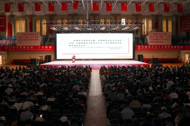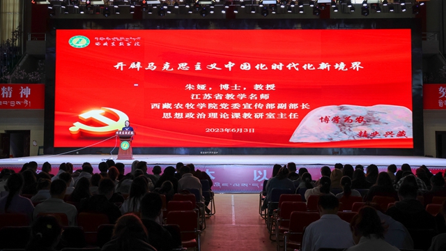 学习新思想,奋进新征程。6月3日,西藏农牧学院文体馆内济济一堂,时而响起热烈的掌声,校党委宣传部副部长、思政教研室主任朱娅教授在这里讲授“形势与政策”课,全校大一大二大三5000多名本科生按照年级分为三场上课,分别由辅导员赵家顺、达娃卓玛、王倩倩主持。