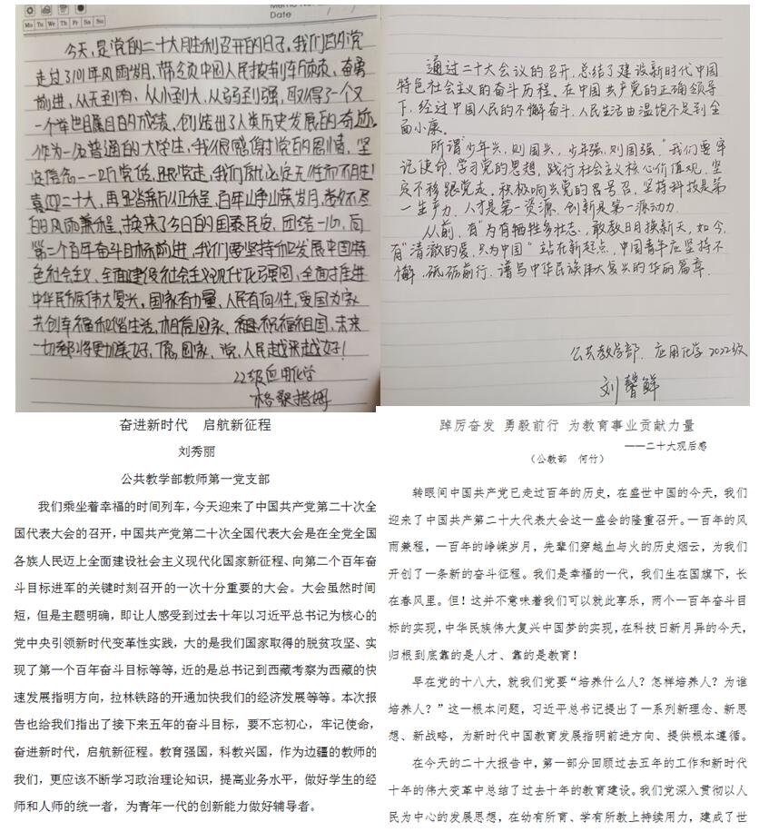 公共教学部段成武教授表示,作为一名基层教师党支部书记,要认真落实校党委和部党委的相关工作部署,抓好党员日常的思想教育,做好支部党员的思想政治工作。在工作和生活中认真学习贯彻二十大精神,不断加强政治理论和业务技能的学习,不断提高自身素质,努力工作,积极投身中国特色社会主义伟大事业。公共教学部青年教师张少波表示,艰难方显勇毅,磨砺始得玉成,青年教师要坚定理想信念,保持政治定力,紧跟党的步伐,牢记党员身份,用实际行动为中华民族伟大复兴谱写新的篇章。公共教学部2022级应用化学新生刘馨鲜表示,作为一名普通大学生,应牢记使命,积极响应党的号召,坚定不移跟党走,站着新的起点,中国青年要坚持不懈,砥砺前行,为中华民族伟大复兴贡献自己的力量。