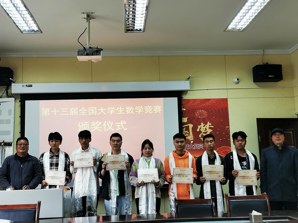 我校8名学生在第十三届全国大学生数学竞赛赛区赛获得优异成绩。5月13日上午公共教学部数学教研室敬久旺老师、洛桑老师和刘秀丽老师在公共教学部会议室为获奖学生举办了颁奖仪式。