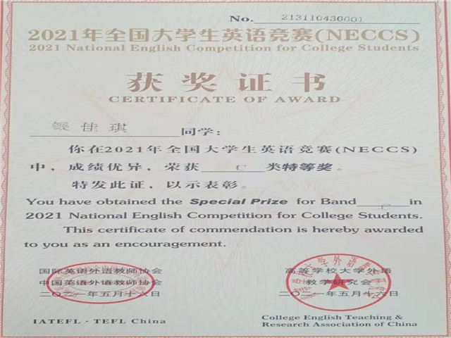 公共教学部英语教研室组织我院82名英语能力较为突出的同学参加了2021年全国大学生英语竞赛(NECCS),经过今年4月26日初赛的选拔和5月16日决赛的拼搏,我院学子在2021年全国大学生英语竞赛中再次创造佳绩:斩获全国特等奖1名,全国一等奖1名,全国二等奖3名,全国三等奖4名,还有14名同学荣获了校级一二三等奖,20名同学获得了校级优秀奖。此外,今年全国特等奖获得者银佳琪同学和2020年全国特等奖获得者王汉嵩同学还获得了晋级2021年全国大学生英语竞赛全国总决赛的资格。