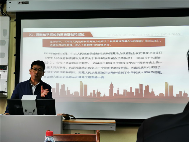 讲座由公共教学部党委书记衡思泉主持,由校宣传部部长巴桑次仁主讲。巴桑次仁老师围绕西藏和平解放70周年,从五个方面展开论述,一是西藏和平解放的历史基础和经过,二是西藏和平解放的意义,三是70年来西藏经历的重要历史期,四是70年来西藏的变化,五是西藏的明天更美好。通过以上五个方面详细阐述了西藏和平解放70年以来西藏社会发生的翻天覆地的变化,党领导下的新西藏取得的举世瞩目的成就。