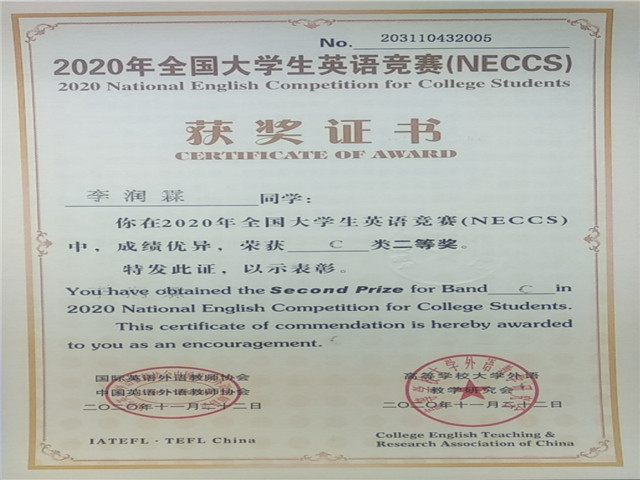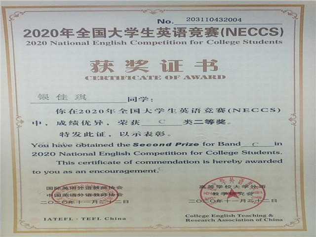 2020年全国大学生英语竞赛(NECCS)决赛于11月20日西藏农牧学院举行,经过全国大学生竞赛组委会的认定,我院学子在本次竞赛中斩获佳绩。其中2018级环境科学本科班的王汉嵩同学荣获全国特等奖,2018级林学本科班的邬玲同学荣获全国一等奖。2018级园艺的孟世伶、2019级农资班的银佳琪同学,19电子本的李润霖同学,荣获了全国二等奖,2019级植保本的肖含同学,2018级动物医学的曾悦琛同学,2019级的普隽坤同学,2019级林学本的高智远同学分别荣获了全国三等奖。