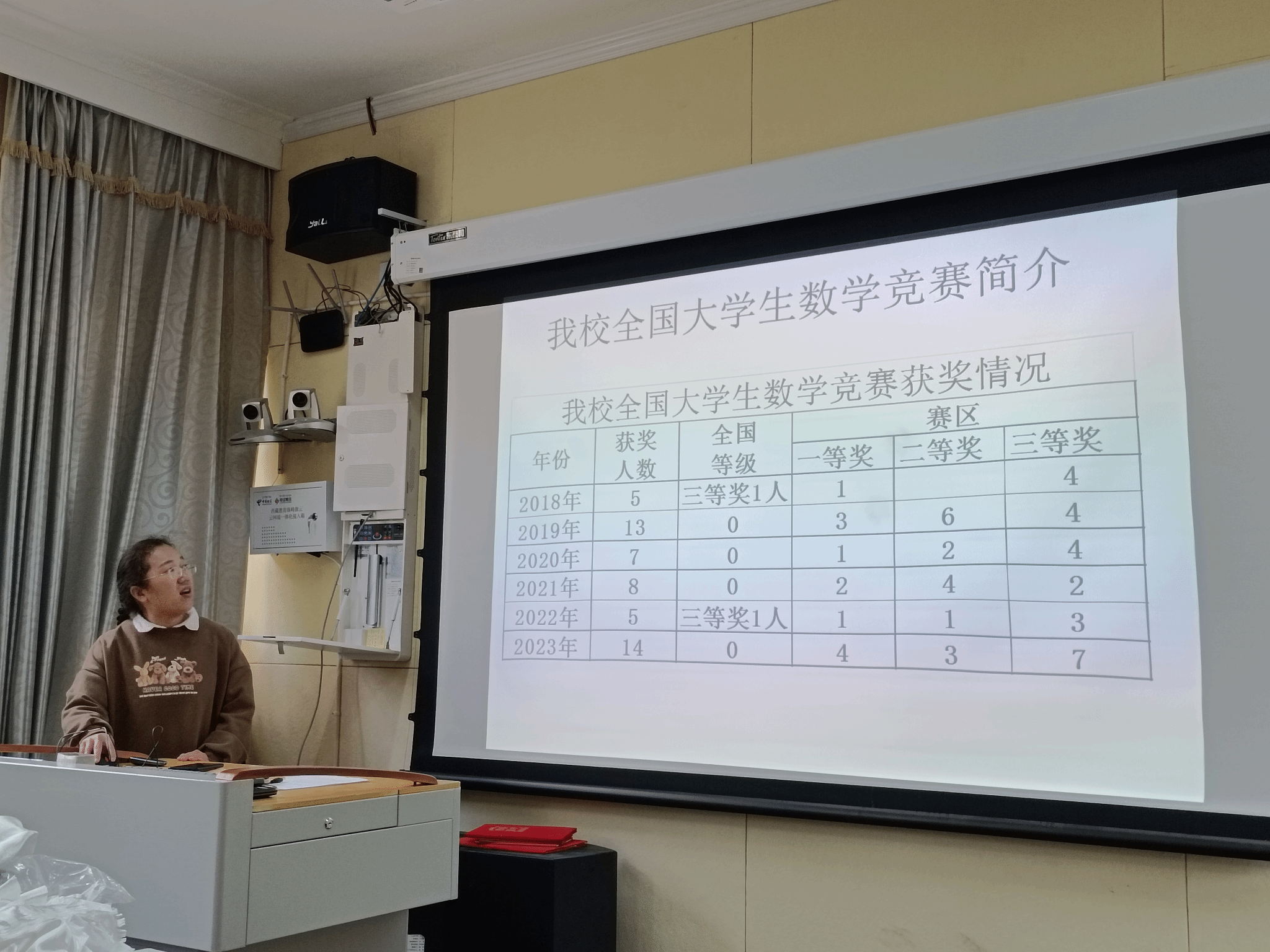 首先,刘秀丽老师代表数学教研室做了总结报告。她对全国大学生数学竞赛以及我校自2018年以来参加全国大学生数学竞赛的情况进行了介绍。在2023年我校获得一等奖4人、二等奖3人、三等奖7人是历年获奖最多的一年,参赛成绩最好的一年。