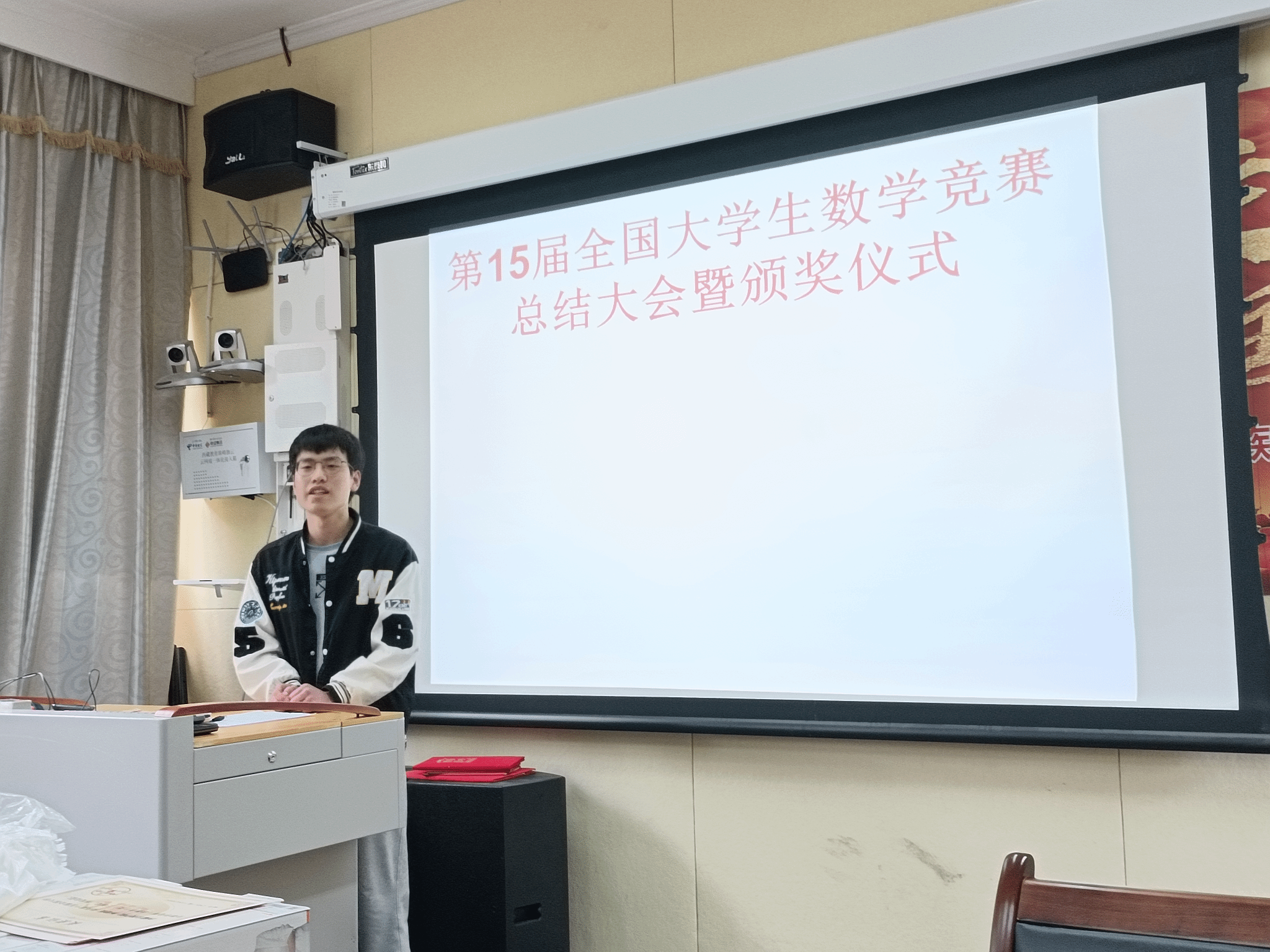 其次,我校本届一等奖获得者王燊作了发言。他讲述了两次数学竞赛成绩和一次数学建模成绩为自己研究生复试所做的加法贡献,参加数学竞赛不仅锻炼了自己的数学计算与数学思维能力,也锻炼了自己克服困难和挑战自我的能力。接着曾获全国三等奖和两次赛区一等奖的刘青平同学做了发言。他讲述自己从大一下学期开始准备数学竞赛,在学习过程中加强相关赛题的训练,在与数学老师们的讨论学习中总结数学方法,在大量的练习中总结数学计算技巧。通过参加数学竞赛不仅锻炼了他的数学思维,更重要的是让他收获了数学思想和数学方法,这些收货助力他在专业课中收货满满,为他获得2022-2023学年全国大学生国家奖学金添砖加瓦。刘青平决定继续参加2024年全国大学生数学竞赛,积极备赛争取为自己大学学习生活画下圆满的句号。