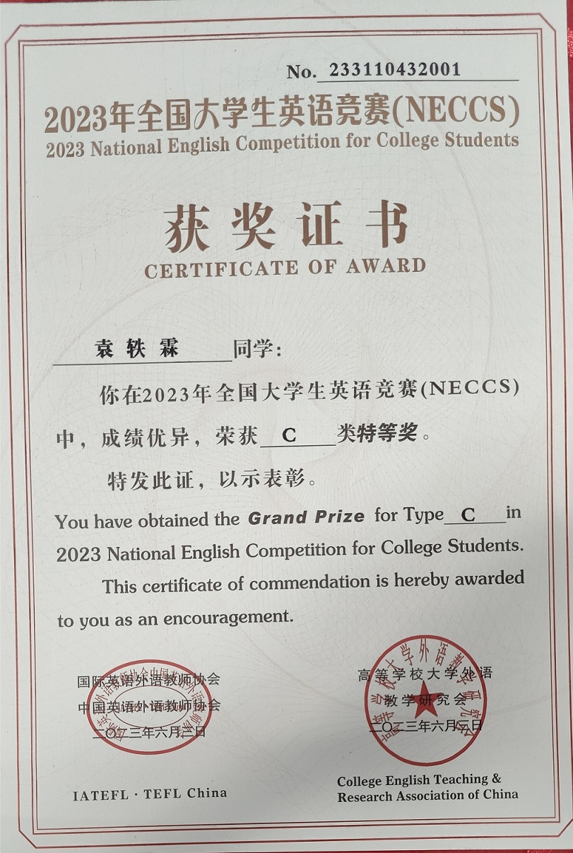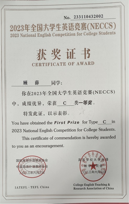 全国大学生英语竞赛(NECCS)是高等学校大学外语教学指导委员会和高等学校大学外语教学研究会组织的全国唯一一个考查大学生英语综合能力的竞赛活动。本次全国大学生英语竞赛由教务处主办,公共教学部外语教研室承办,全体教师共组织了我校94名英语能力较为突出的同学参赛。经过今年5月7日初赛的选拔和6月3日决赛的拼搏,最终经过全国大学生英语竞赛组委会认定,我校学生在2023年全国大学生英语竞赛中斩获全国特等奖1名,全国一等奖1名,全国二等奖2名,全国三等奖5名,还有12名同学荣获了校级一二三等奖。