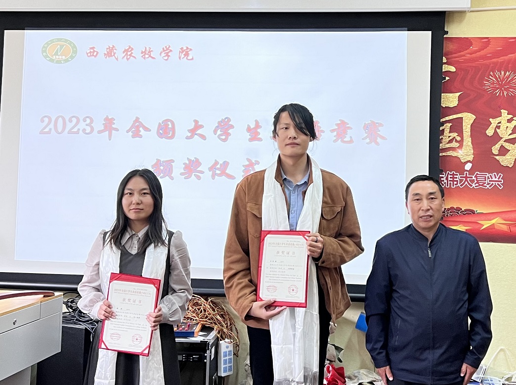 图为西藏农牧学院教学督导委员会黎普明主任颁发全国特等奖和全国一等奖获奖证书