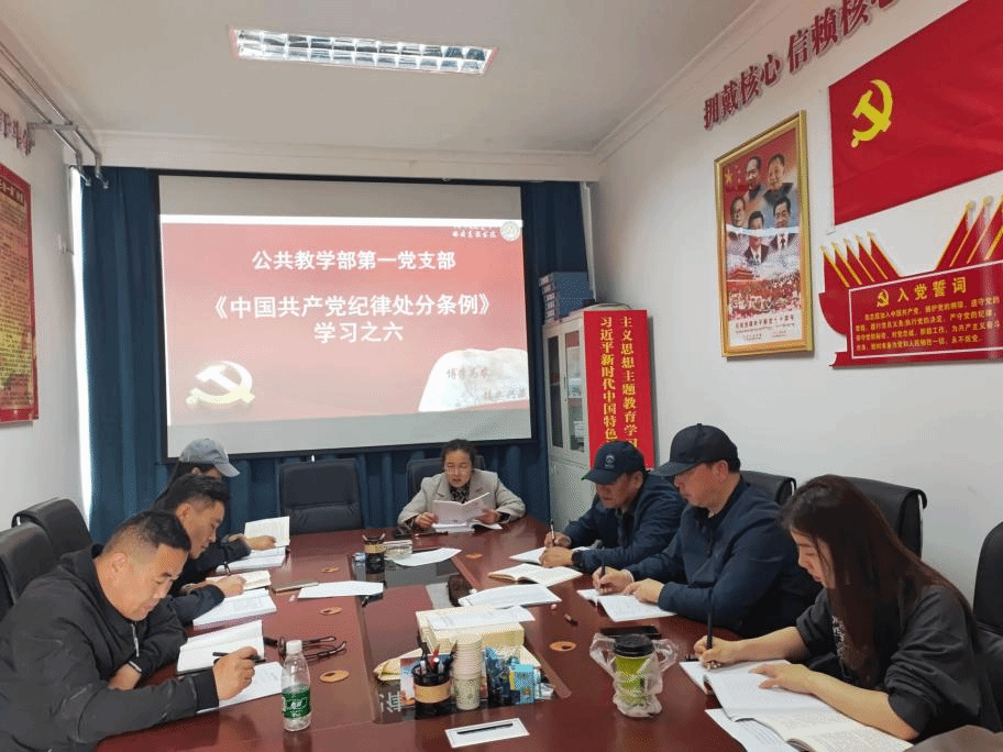 公共教学部教工第一党支部全体党员于6月13日上午在党员活动室开展了党纪学习教育学习会,会议由刘秀丽同志主持,贺玺浦主任和全体党员参加了此次学习。
