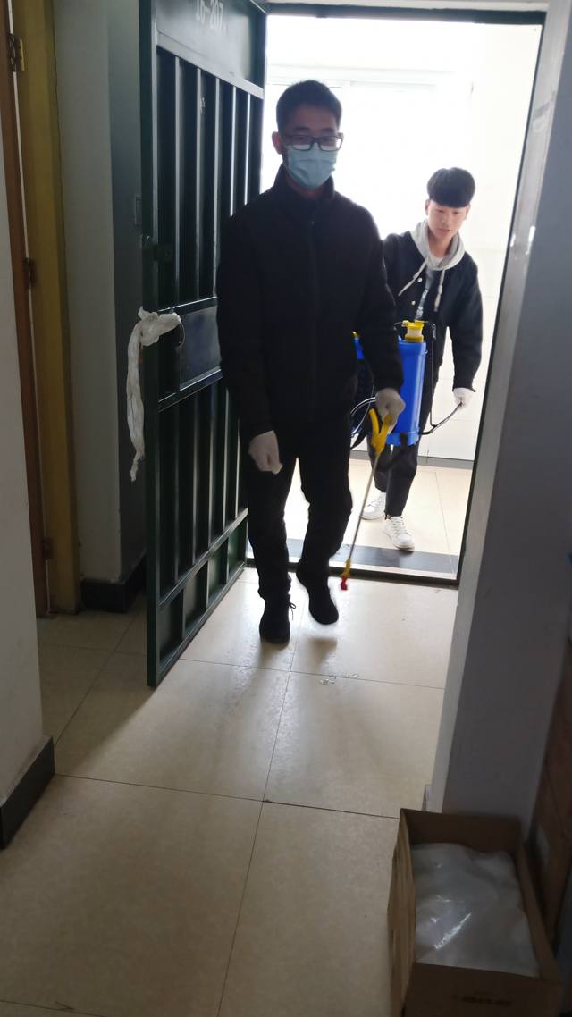 消毒工作开始,由公共教学部学生会成员将消毒时间告知学生,通知各宿舍长做好准备,避免消毒工作中不必要的干扰。消毒过程中,消毒人员对宿舍各个角落都进行了严格细致的消毒、并就宿舍卫生存在的问题各宿舍长进行交流,公共教学部消毒工作结束。