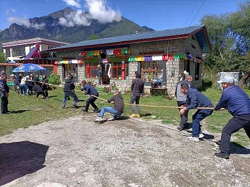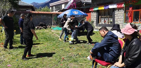 活动中大家团结协作动手制作美食,有的洗菜、有的煮土豆、有的摆零食大家都融入了集体活动中开始了放松心情的美好一天,下午还开展了拔河、踩气球、抢凳子、踢毽子等丰富多彩的体育活动。