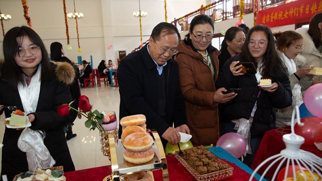 3月8日下午,全体教职员工齐聚教职工食堂二楼,共同庆祝第111个三八国际妇女节。院党委副书记、副院长王从严出席活动现场并致辞。王从严副书记代表学院党委、行政给全体女教职员工送上亲切慰问和衷心祝福,并与男县处级领导一起为参加活动的所有女教职工敬献哈达,送上花,现场气氛十分热烈。 随后,踩气球、大象转、企鹅漫步、唱歌、品尝美味甜点等趣味活动将整个庆祝活动推向高潮,女职工们积极参与,活动现场掌声阵阵,笑声不绝,女职工们沐浴在幸福快乐的节日氛围中。 院教育工会还组织开展关爱女性健康行动,为女职工进行“两癌”筛查,使女职工充分感受组织的关爱,学院党委、行政的关心。
