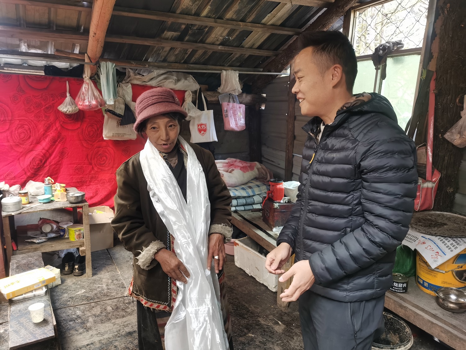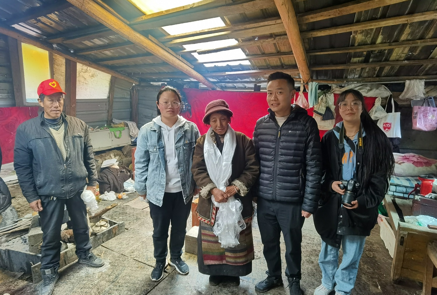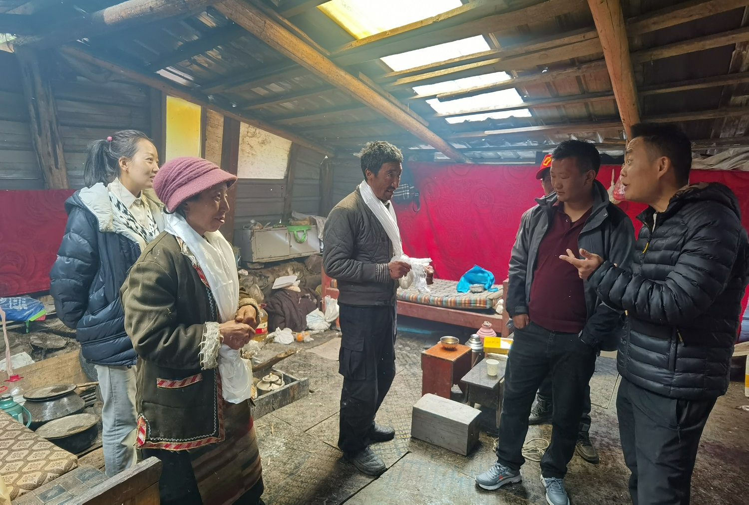初见卓嘎同志时,她及家人正在公路边的一处小木屋前喂牛,谈及现在的生活,他们说在边陲放牧,就是在边陲巡边,几十年如一日的用行动践行“再苦再累也要守好祖国的每一寸土地”、“家是玉麦,国是中国,放牧守边是职责”,交谈中让科研人员深深体会到卓嘎一家人戍守边疆的坚定信念和他们扎根雪域边陲,做神圣国土守护者、幸福家园建设者的决心。