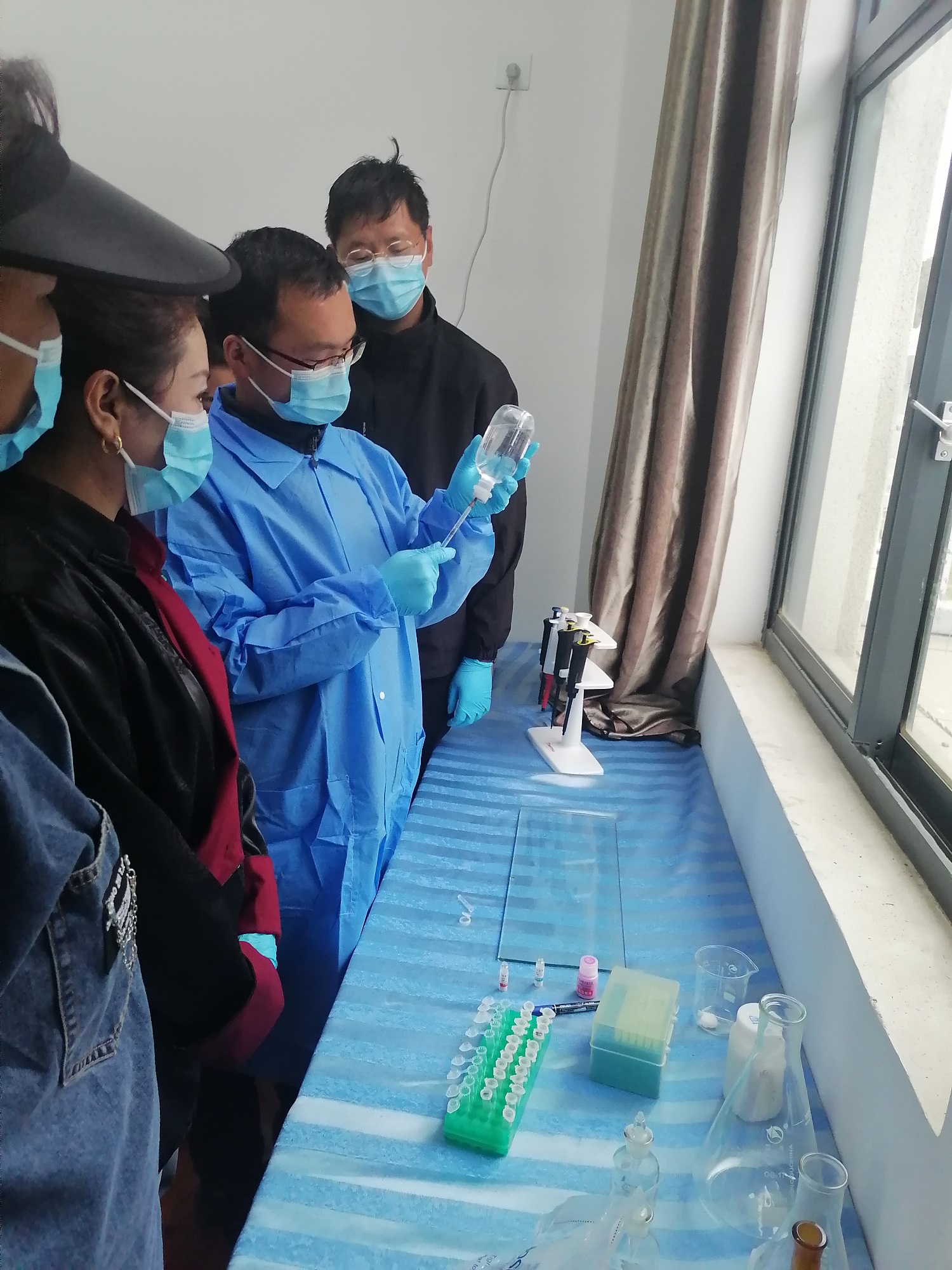本次培训的主题是布鲁菌病的预防,培训主要包括该病的概况、流行特点、临床症状、诊断与预防和检测流程。根据当地实际情况着重强调疑似病例要及时向相关行政部门汇报和送检,要进行病畜的隔离饲养和养殖场地的消毒工作。随后在娘亚牦牛基地和嘉黎县昂仓畜产品专业合作社进行调研,检查了牦牛疫病防控情况并进行了详细记录,要求每个养殖专业人员一定要按照动物疫病防控工作要求做好各项免疫档案,做到定期定时定量注射疫苗工作。而后在实验室开展了布氏杆菌病的检测技术培训工作,相关人员进行学习和实践操作,过程中对专业技术员提出的技术问题进行了详细的解答,对不正确、不到位的操作进行了现场指正。