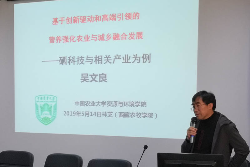 吴文良教授做了题为“基于创新驱动和高端引领的农业生态化与城乡融合发展--硒科技与相关产业为例”的专题报告。主要从以下三个方面进行了报告。首先,吴文良教授从硒的特性与生物地球化学循环介绍了相关背景,二是富硒农业、富硒产业与功能农业。三是对西藏--林芝---农牧学院发展建议。