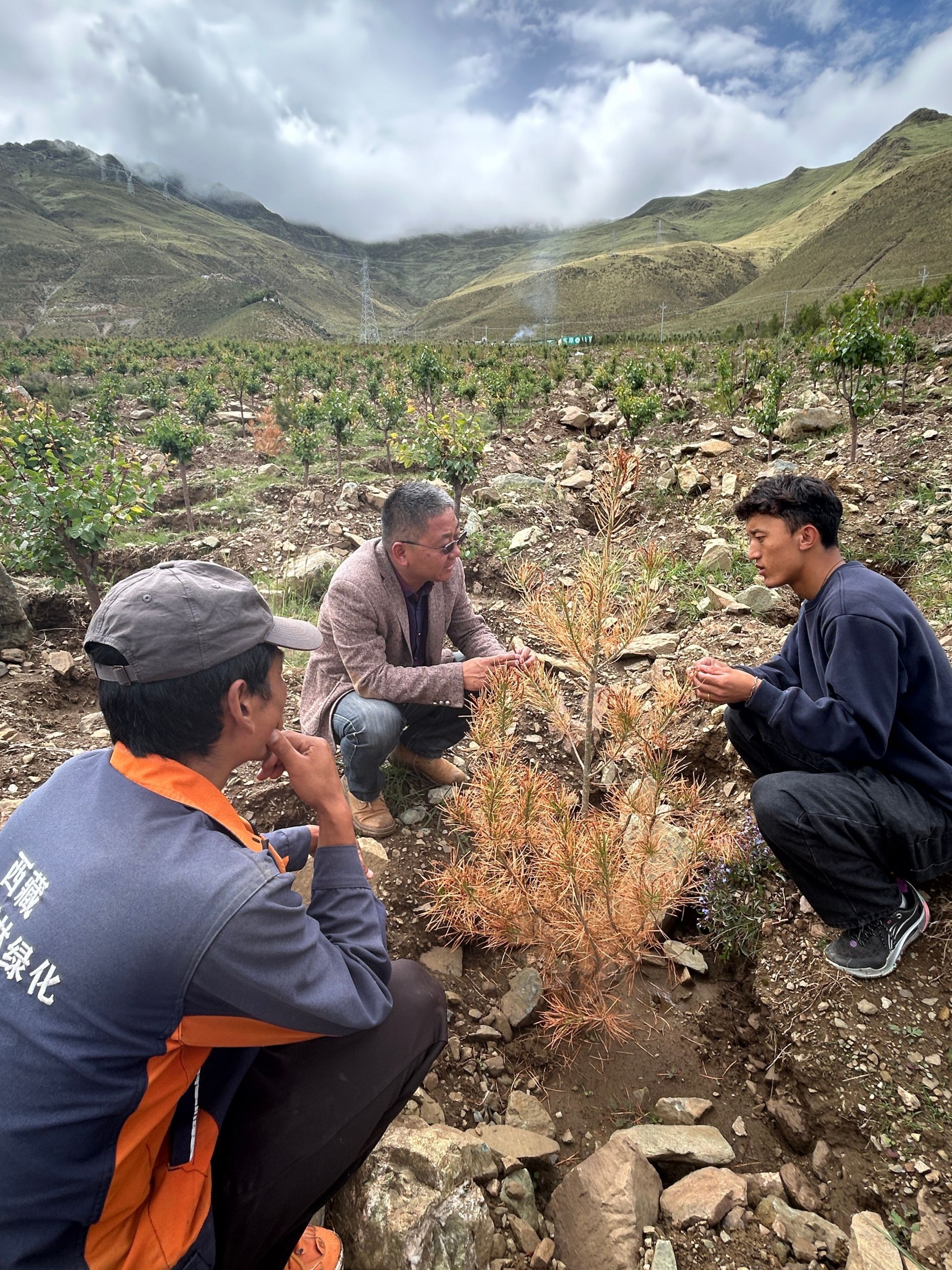 团队首先到拉萨林木科学研究院和拉萨南北山绿化保障性苗圃,深入了解苗木种植、驯化供应等具体情况。随后到桑珠造林片区,了解该区域的造林技术、方法,已完成造林的面积、效果、未来的发展规划以及在造林过程中遇到的问题。针对目前存在的问题,团队提出了如下建议:一是对于直径5cm以上的移植苗木,建议使用专业的支架器进行固定,以确保其稳定生长。二是针对光核桃苗死亡较多的情况,建议补栽时使用容器苗或土球苗,以提高其成活率。三是建议及时剪除干枝,目前,槐树和白皮松的状况良好,预计后期会返青,但仍需关注其生长情况,及时进行修剪。四是为了促进树木的生长,建议明年春季灌溉时补充氮肥,以提供充足的养分。五是结合周边杨树和柳树有多株死亡的情况,可能会对造林地造成潜在威胁,建议及早调查死亡原因,并采取措施防止问题传播到造林地。六是冬灌工作对于确保苗木安全过冬至关重要,建议切实做好冬灌工作,确保苗木得到充分的保护。