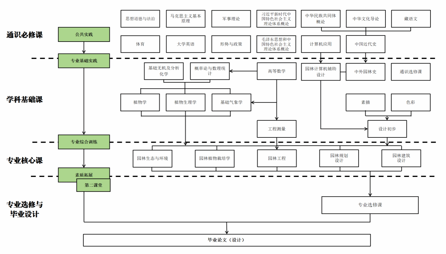 培养目标4:培养能够适应园林规划设计、小城镇绿化规划建设、人居环境、国家公园(自然保护区)规划设计、园林工程施工等领域需求的复合应用型高素质专业技术人才。