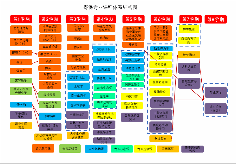 军事技能训练、劳动教育实践、创新创业实践、植物学Ⅱ、植物资源学、土壤学、野生动物管理学、自然保护区学、生物多样性监测、湿地学、西藏野生动物、森林生态学、自然教育导论、动物生态学等课程实习
