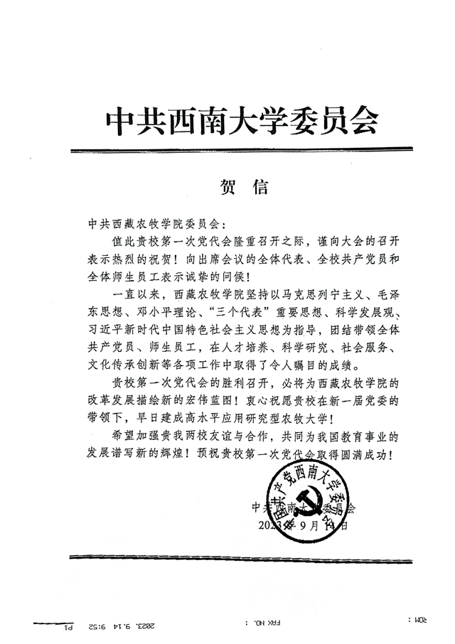 中共西南大学委员会发来贺信
