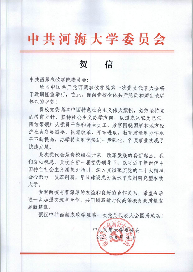 中共河海大学委员会发来贺信