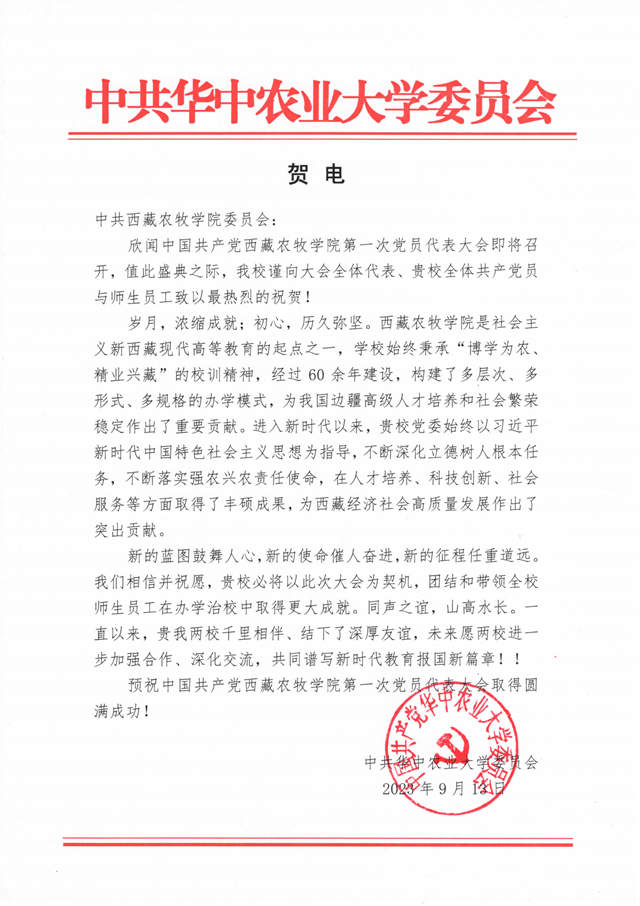中共华中农业大学委员会发来贺电