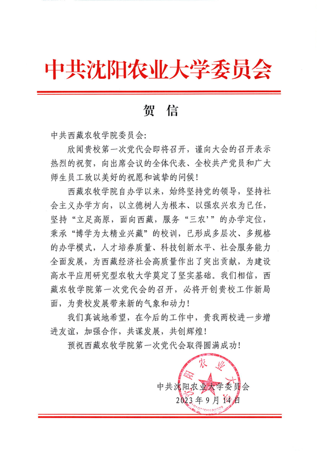 中共沈阳农业大学委员会发来贺信