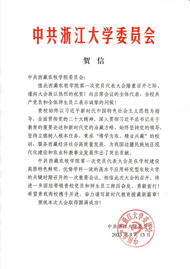 中共浙江大学委员会发来贺信
