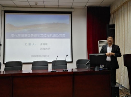 报告题目是变化环境寒区关键水文过程机理及响应。余教授主要从寒区关键水文过程机理及响应的立项背景;研究目标,研究内容与关键问题;研究方案,技术路线与研究特色等三个方面对青藏高原寒区冻土退化趋势,寒区水文实验模型研究,在高寒地区其变化环境对水文机理、水文模型研究建设所面临的挑战和难点等方面给我院师生做了较详细地阐述。