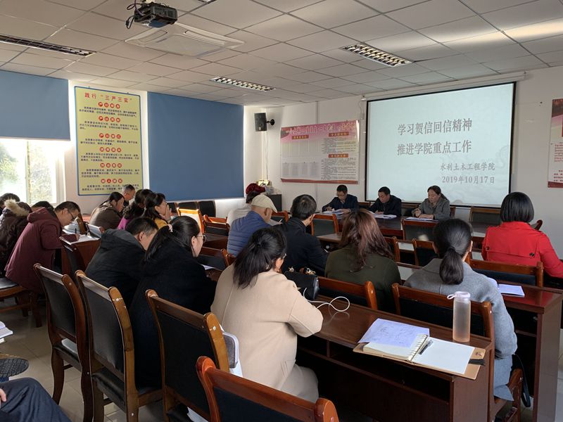 习近平总书记的贺信精神和回信精神在我院引起了强烈反响,在我院广大师生中也迅即兴起了学习贯彻贺信精神和回信精神精神的热潮。我院把学习贯彻贺信精神、回信精神作为当前和今后一个时期的一项重大政治任务,结合“不忘初心、牢记使命”主题教育,以学习贯彻贺信和回信精神为动力,指导实际工作,推进学院各项工作向前发展。为扎实深入推进我院“不忘初心、牢记使命”主题教育,深刻认识学习贯彻贺信和回信的重要意义,把学习贯彻贺信和回信精神贯穿主题教育始终,2019年10月17日下午,水土学院开展了贯彻习近平总书记贺信和回信精神学习会,学院全体无课教职员工参会,会议由黎普明院长主持。