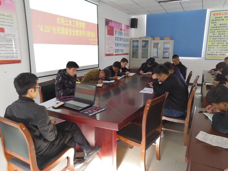 在第四个全民国家安全教育日到来之际,为深入学习贯彻习近平新时代中国特色社会主义思想,进一步强化我院学生的总体国家安全意识,营造和谐稳定的校园环境,根据《教育部办公厅关于开展2019年“4.15”全民国家安全教育日活动的通知》精神、自治区教育厅和学校相关要求,水利土木工程学院于4月12日18:10在学院会议室召开“全民国家安全教育学习座谈会”。出席本次会议的有学院党委副书记潘多、辅导员崔立岩及学院全体学生干部。
