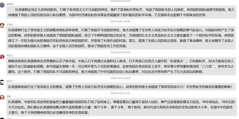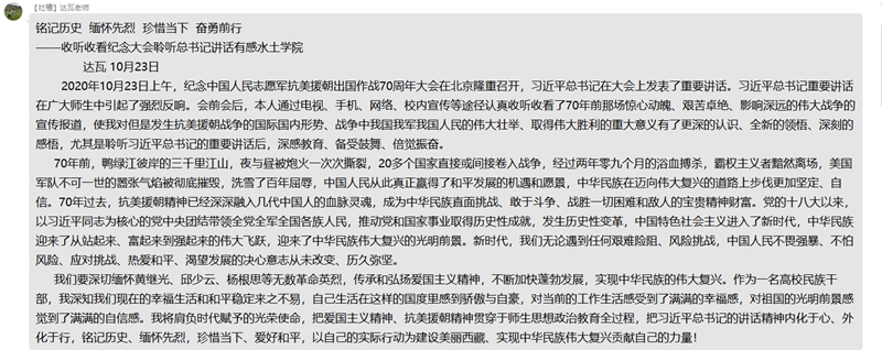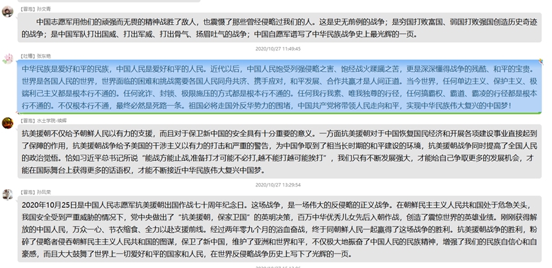 --掀起学习交流热潮。10月26日上午,我院组织师生党召开线上学习交流会,撰写心得体会,通过各种方式表达自己对抗美援朝战士的缅怀与崇敬。每位教工党员都在线上发表了学习习近平总书记讲话精神的感想体会,纷纷表示将在工作中继续发扬和传承伟大的抗美援朝精神,以英烈为楷模,继承斗争精神,发扬优良传统,不忘初心、牢记使命,努力为事业发展、改革稳定做贡献。学生们表示作为当代大学生,更应该肩负起中华民族伟大复兴的责任,沿着中国梦的道路走下去,牢记使命,不忘初心!用手中的笔书写自己的梦想,立鸿鹄之志,为中华之崛起而读书!