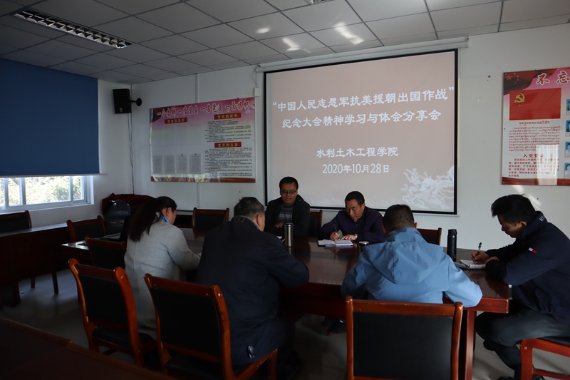--组织专题学习分享会。10月28日上午,我院全体党委班子成员组织开展“中国人民志愿军抗美援朝出国作战”纪念大会精神的学习体会分享会。会上每位领导做了发言,谈了体会,表示面对现在复杂多样的国际局势,我们要立场坚定,继续保持斗争精神,奋勇搏击,化危为机,危中寻机,铭记历史,展望未来,珍惜当下,珍惜先辈们用血肉汗水换来的美好生活。