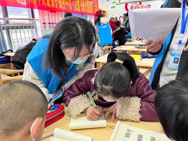上午9:30,在我院志愿者的组织下,儿童有序进入双拥路社区党群服务中心二楼会议室参加“五社联动”,助力一老一小活动启动仪式。活动结束后,志愿者带领儿童进入教室上课,指导孩子们完成老师在课堂上布置的绘画任务,并鼓励孩子们积极展示自己的作品。下午,我院藏族同学为孩子们上了一堂藏文书法课,教孩子们藏文辅音字母的正确发音与笔顺,让孩子们对藏文辅音字母的发音和笔顺有了更加全面的了解。随后,志愿者为孩子们辅导作业并与孩子们一起阅读,分享阅读的感想感悟,培养孩子们养成“好读书、读好书”的习惯。本次助教活动于下午18:00在孩子们一片欢声笑语中圆满结束。